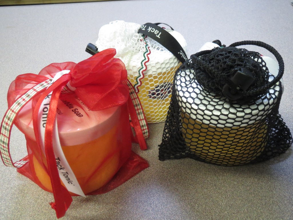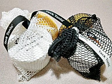 Tack Tonic® Saddle Soap comes in 10 and 12 ounce containers. Our Tack Tonic® Tack Pack® is a mesh bag that holds Tack Tonic Saddle Soap and sponge. The Tack Pack® comes in black or white mesh with our 12 oz Tack Tonic Premium Saddle Soap.
